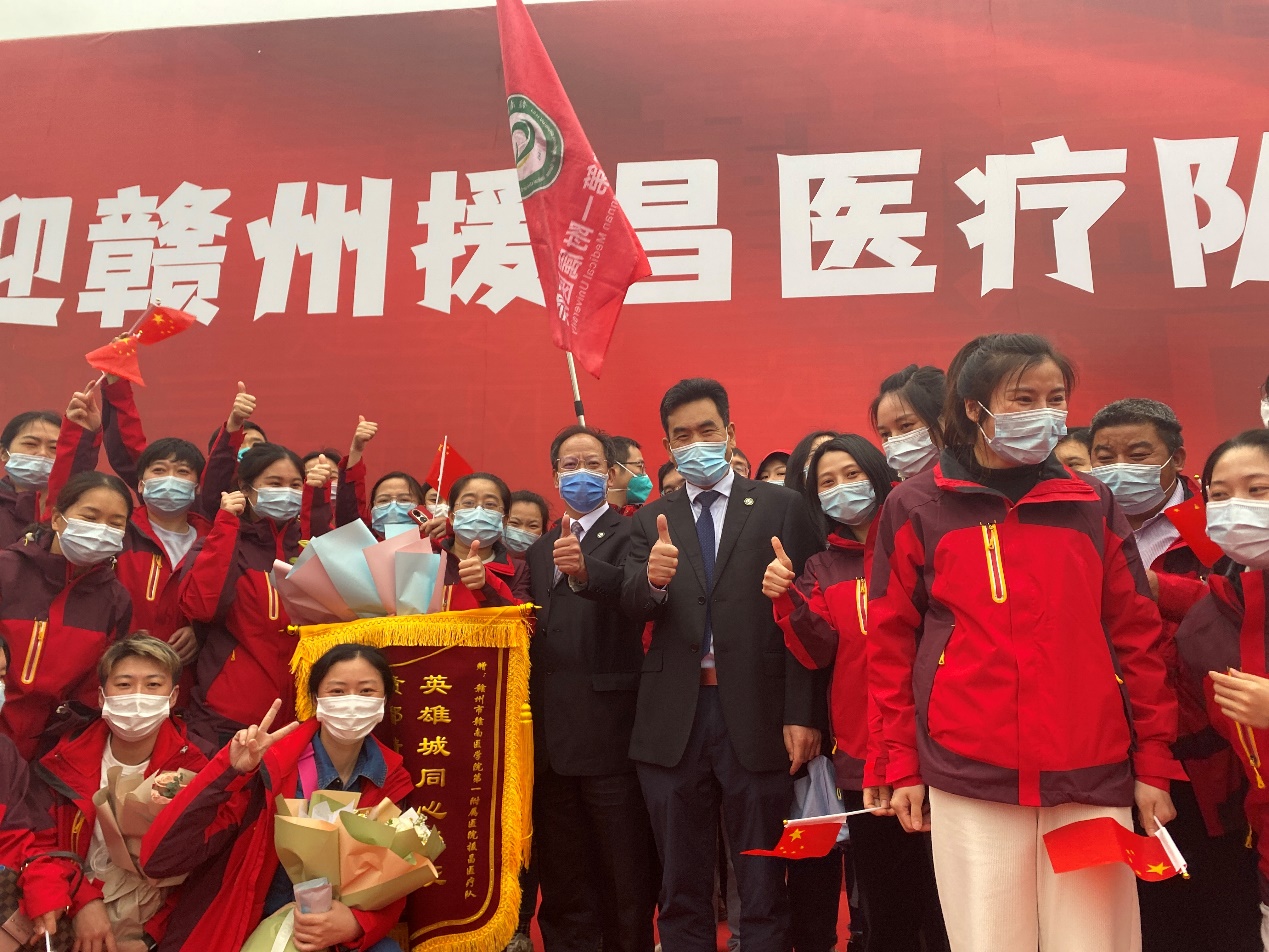 4月30日下午,我校一附院支援南昌抗疫的40名核酸采样医护人员顺利完成支援任务凯旋,赣州市疫情防控指挥部在赣州西站新时代广场举行欢迎仪式,迎接英雄回家。赣州市政协副主席、市卫健委党组书记、主任刘春文,以及一附院负责同志,全市各县(市、区)卫健委、市直和驻市医院领导到场迎接。