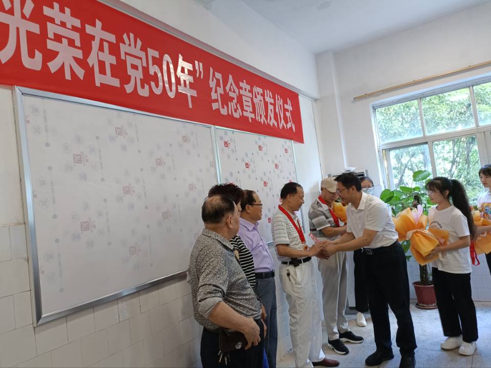 曾泽鑫为“光荣在党50年”的老党员颁发了纪念章,青年代表向老党员献花致敬。老党员纷纷表示,感谢党中央的关心,要不忘初心、牢记使命,永葆共产党人的本色。