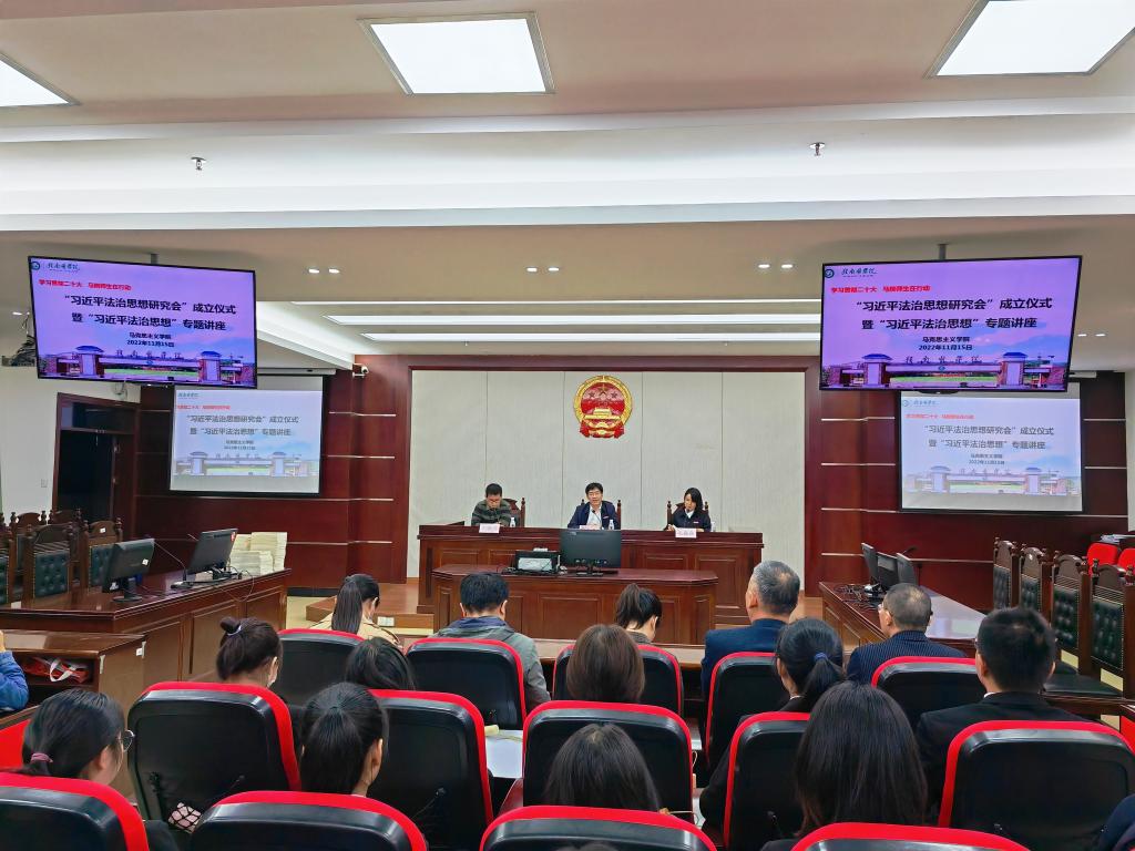 11月15日,马克思主义学院“习近平法治思想研究会”成立仪式暨“习近平法治思想”专题讲座在模拟法庭举行。学校党委委员、马克思主义学院院长、学校习近平新时代中国特色社会主义思想研究中心主任廖志平出席并致辞,习近平法治思想研究会全体成员参加活动。