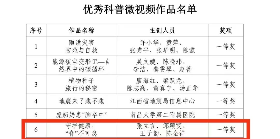 2022年12月31日,江西省第二届优秀科普微视频评选活动落下帷幕,大赛共有642份参赛作品推荐入围,最终经形式审查和多轮次的专家评审后,共121个作品获奖。护理学院老师许金仙指导的学生作品《守护健康,“脊”不可怠》荣获大赛一等奖。