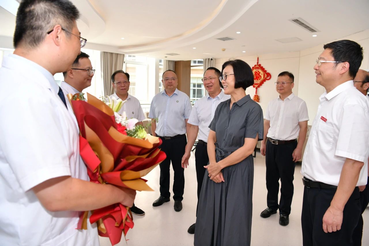 吴忠琼首先来到一附院,走进急诊楼全科医学病区,亲切看望医师代表刘万蓉、钟田雨、刘晓峰,向他们献上鲜花、祝贺节日,感谢大家为增进人民健康福祉作出积极贡献,并通过他们向全市广大医务工作者致以诚挚问候和崇高敬意。