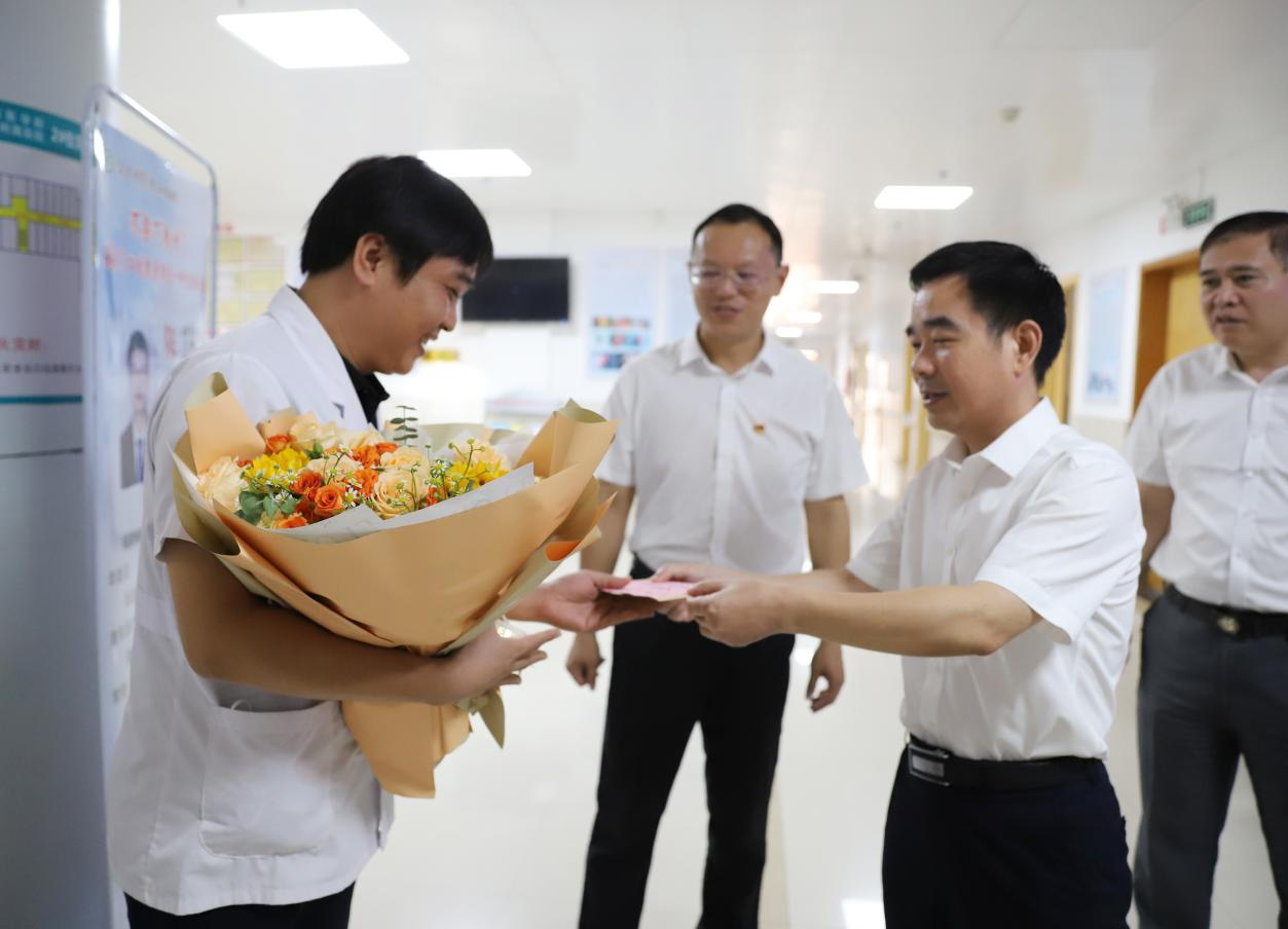 学校党委委员、纪委书记、省监委驻赣南医学院监察专员、二级高级监察官黄海军来到第二附属医院,走访了检验科、儿科、外一科、妇产科、血液中心等科室,看望慰问了一线优秀医师代表黄梨华、黄文生、何小红,对他们的辛勤付出表示真挚的感谢,勉励他们不忘医者初心,牢记健康使命,以更高的标准严格要求自己,立足岗位再创佳绩、再立新功。
