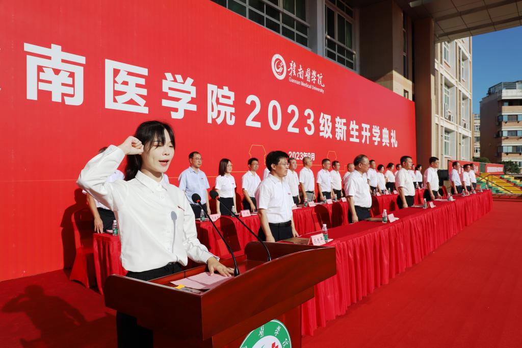 在第一临床医学院2022级麻醉学专业本科1班冯婷婷同学领誓下,全体新生诵读《医学生誓言》。