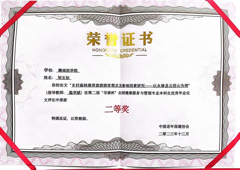 在首届全国本科院校健康服务与管理专业优秀毕业论文评比中,由公共卫生与健康管理学院吴清锋教师指导的罗炫宁同学毕业论文《赣州市和武汉市高校大学生亚健康流行现状与影响因素研究》荣获全国一等奖,李钧、温华斌教师分别指导的宋芯、邹玉如同学毕业论文《赣州市公共卫生服务能力与区域经济耦合度分析》《乡村森林康养旅游游客需求及影响因素研究——以永修县云居山为例》均荣获全国二等奖。