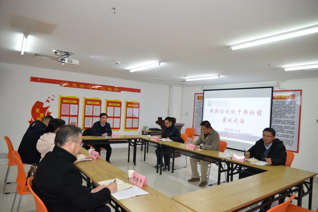 12月21日下午,校党委委员、纪委书记、监察专员、二级高级监察官黄海军对学校2023年新提任的处级干部进行任前廉政谈话,为他们在新的工作岗位上拒腐防变打“预防针”,督促扛牢全面从严治党政治责任。