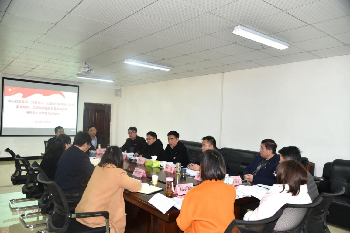 12月27日,学校党委委员、纪委书记、监察专员、二级高级监察官黄海军到马克思主义学院调研,学校党委委员、党委宣传部部长廖志平参加调研。
