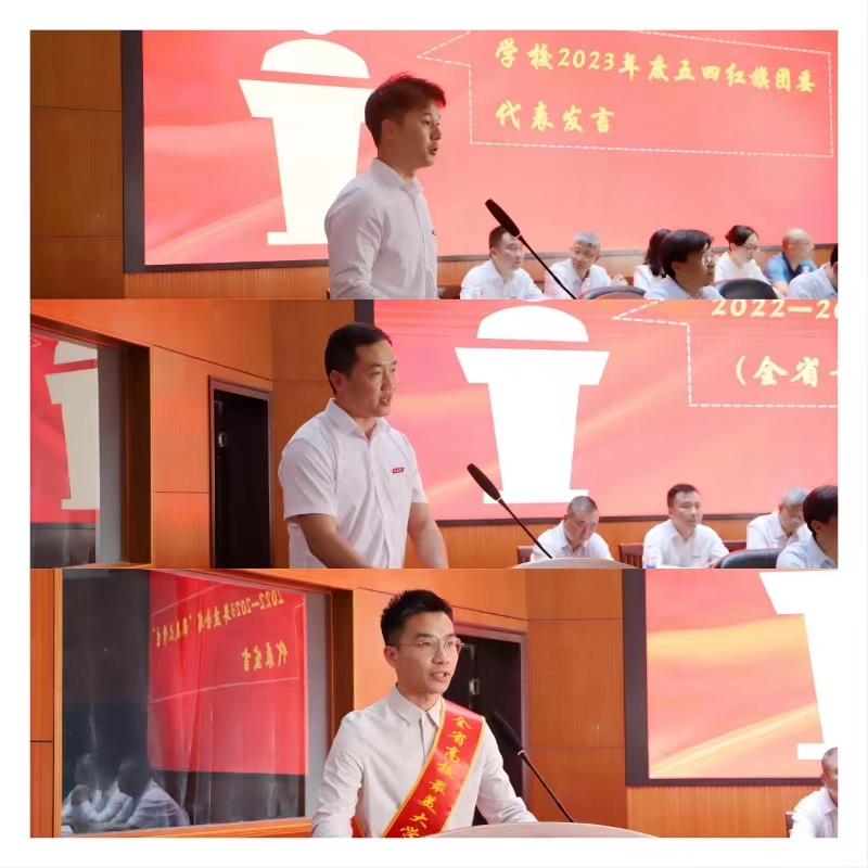 学校2023年度五四红旗团委袁东波、2022-2023年度全省优秀共青团干部(全省最美辅导员提名)曹奎、2022-2023年度全省“最美大学生”提名赵锐先后发言。