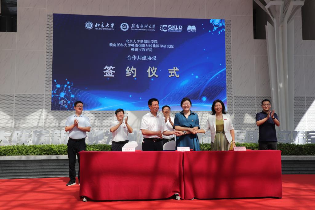 仪式上,北京大学基础医学院党委副书记孙傲伊,赣南创新与转化医学研究院党委书记曾小英,赣州市委教育工作领导小组秘书组常务副组长谢济明共同签署了“北京大学基础医学院、赣南医科大学赣南创新与转化医学研究院、赣州市教育局”合作共建协议。