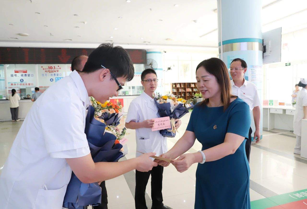 “今天是医师节,是你们的节日,我们代表学校向你们致以最崇高的敬意和最深切的感谢。你们用精湛的医术守护着赣南及周边地区人民群众的生命健康,你们是学校、医院的骄傲,也是社会的宝贵财富。”每到一处,廖伟、黄瑞忠都与医师们亲切握手、交谈,送上鲜花和祝福,传递学校党委对医师们的关爱,询问他们的工作和身体状况,感谢他们常年坚守在临床一线,为守护人民健康、推动学校和医院高质量发展所做出的贡献,鼓励他们继续发扬红医精神,修医德、行仁术,用精湛的医术和优质的服务不断增进人民健康福祉。