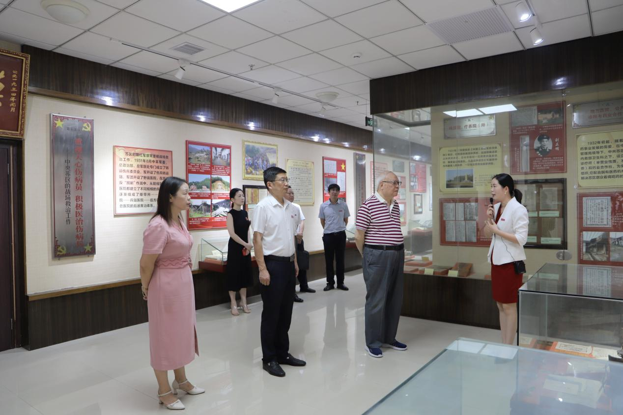 在红色卫生史博物馆,唐朝枢仔细观看馆内历史照片和展品,并不时向讲解员详细了解红色卫生发展历程,对我校充分利用赣南红色文化资源,总结凝练红医精神,建设红色卫生史场馆,用红医文化育人的做法给予了充分肯定。