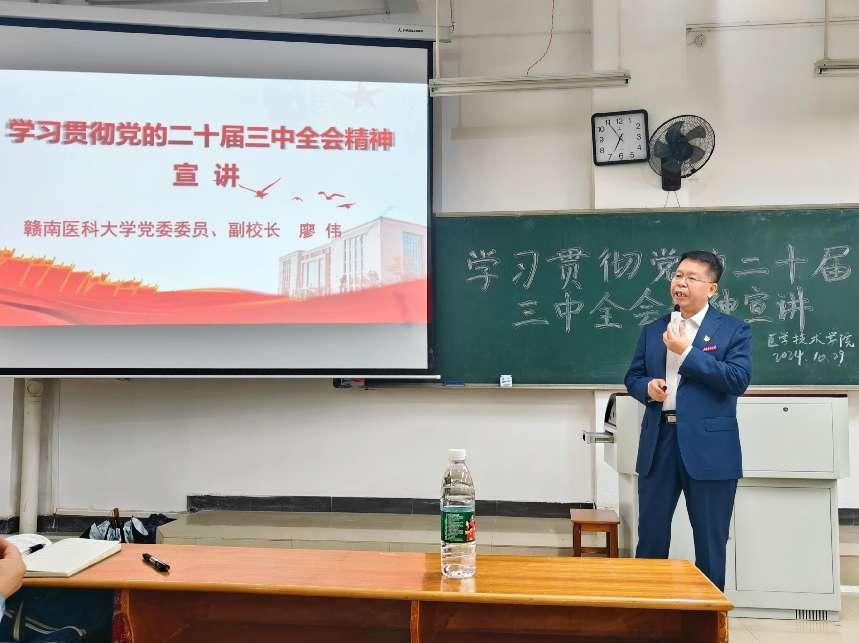 10月29日,学校党委委员、副校长廖伟到医学技术学院宣讲党的二十届三中全会精神,该院全体教职工、学生党员和入党积极分子聆听宣讲报告。