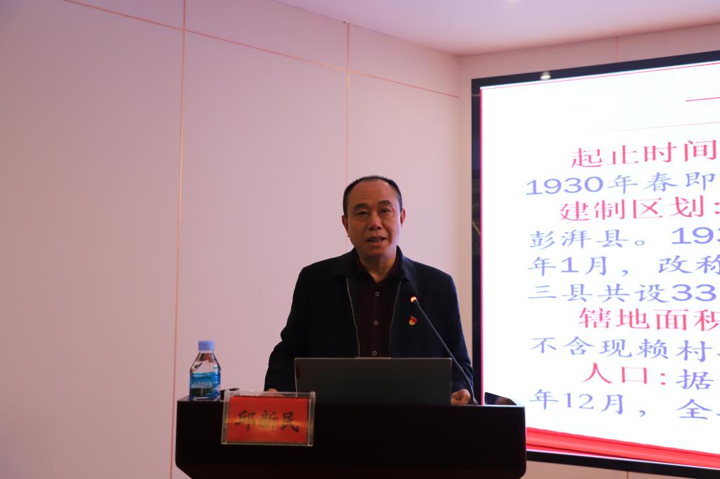 宁都县委史志办原主任邱新民以《解读宁都红色历史,感悟党的初心使命》为题,从宁都苏区的基本概况、宁都苏区的创立和发展、红军在宁都的主要活动、新中国成立前夕的翠微峰战争、宁都苏区的调查研究、宁都对中国革命的贡献和牺牲、宁都在中央苏区的历史地位等七个方面,对宁都红色历史进行了详细介绍。