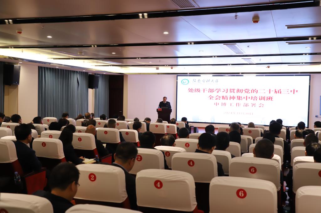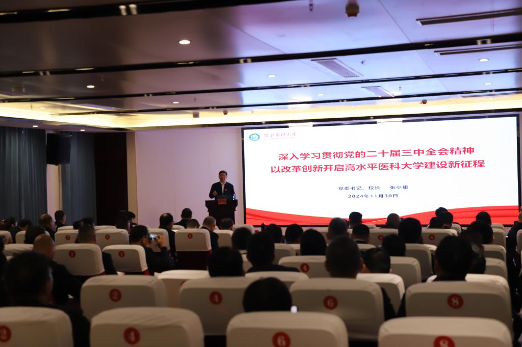 张小康以《深入学习贯彻党的二十届三中全会精神,以改革创新开启高水平医科大学建设新征程》为题,从深刻学习领会党的二十届三中全会精神、系统谋划和推进学校改革发展的主要任务、完成今年目标任务和做好岁末年初各项工作等三个方面,对党的二十届三中全会精神进行了全面系统解读,对学校改革发展和近期重点工作进行了强调部署。他强调,要把思想统一到党的二十届三中全会精神上来,把行动统一到党的二十届三中全会作出的重大决策部署上来,以高质量党建引领学校高质量发展,奋力开创学校高质量发展新局面,努力把学校建设成为特色鲜明、区域一流、国内知名的高水平医科大学。