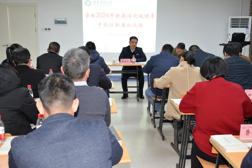 12月20日下午,学校纪委组织2024年新提任处级领导干部开展任职廉政谈话活动,传导全面从严治党压力,引导他们争做新时代“忠诚干净担当”的好干部。学校党委委员、纪委书记、省监委驻校监察专员、二级高级监察官黄海军对新提任处级干部进行了任职廉政谈话。