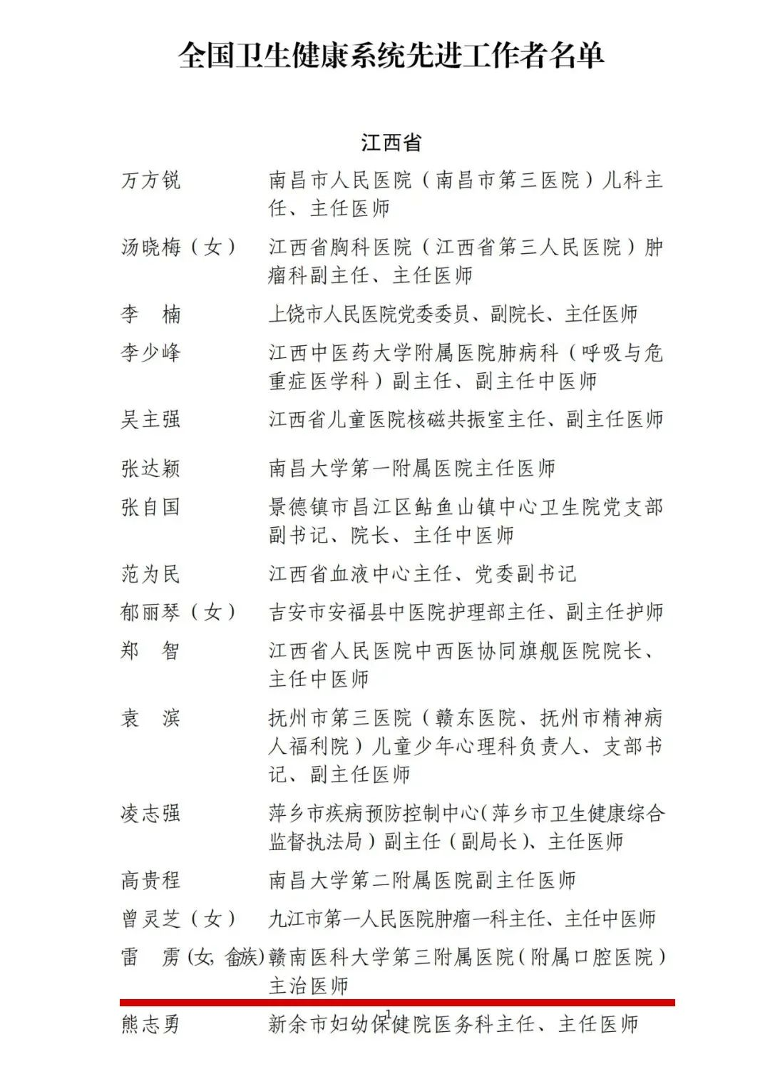 我校第三附属医院(附属口腔医院)雷雳荣获“全国卫生健康系统先进工作者”称号