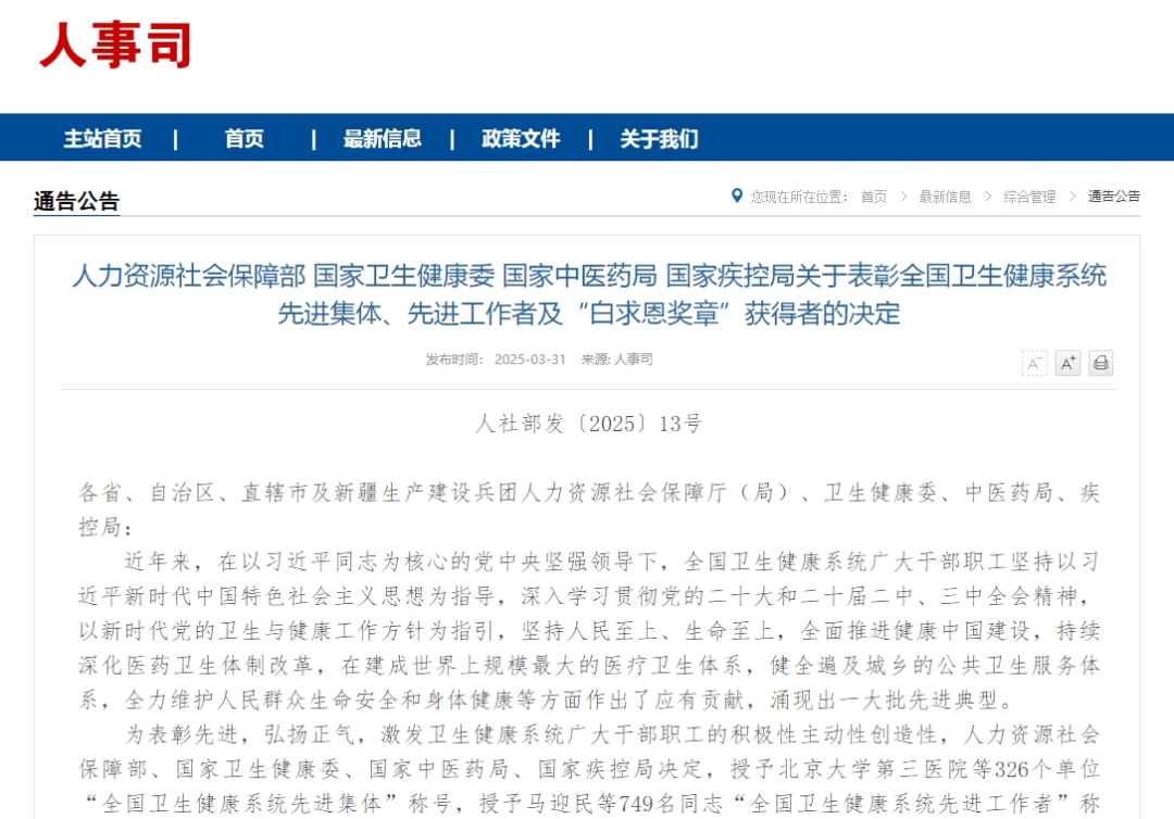 3月31日,国家卫生健康委网站发布《关于表彰全国卫生健康系统先进集体、先进工作者及“白求恩奖章”获得者的决定》,其中,我校第三附属医院(附属口腔医院)口腔内科学教研室负责人、牙周黏膜科主治医师雷雳同志荣获“全国卫生健康系统先进工作者”称号。