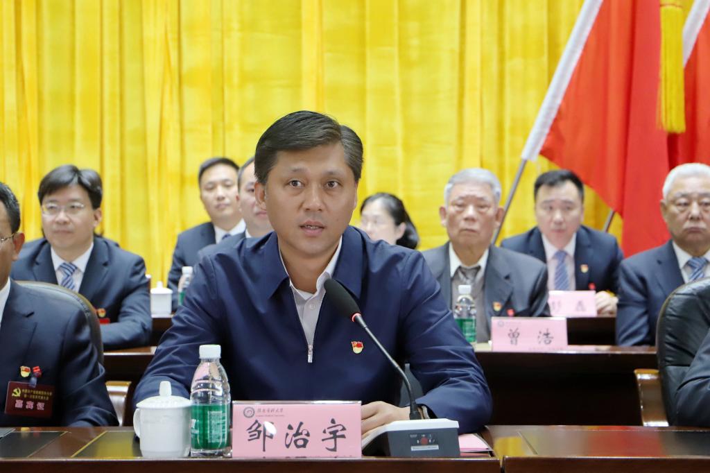 邹治宇代表赣州市委、市政府对大会召开表示热烈祝贺,向各位代表和全校师生员工致以诚挚问候。他指出,在长期的办学历程中,赣南医科大学始终与赣南老区发展同呼吸、共命运,共生共长、相得益彰。希望学校党委以本次大会为契机,始终把政治建设摆在首位,进一步加强理论武装,坚定不移全面从严治党,深入推进教育系统作风建设,涵养良好的政治生态,以优良党风正校风、促教风、带学风。希望学校进一步落实好立德树人根本任务,把思想政治工作贯穿于教育教学的全过程,用好赣南特有的红色资源,传承红色基因,弘扬苏区精神,用革命历史浸润思想,全力培育德技双馨的医学人才。希望学校始终立足赣南、服务地方,坚持内涵与外延协调发展,进一步加强学科建设,坚定申博步伐,加快推动科技创新和产业创新深度融合,为助力新时代赣南老区发展作出新贡献。