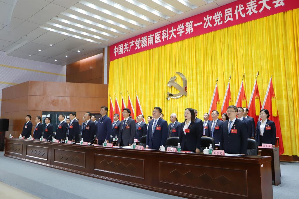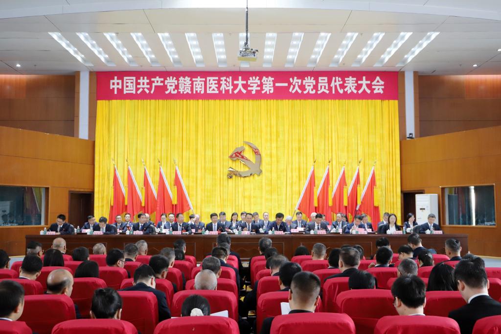 会场气氛浓重而热烈,主席台上方悬挂着“中国共产党赣南医科大学第一次党员代表大会”的会标,金色党徽高悬于主席台正中熠熠生辉,分列两侧的10面红旗鲜艳夺目。