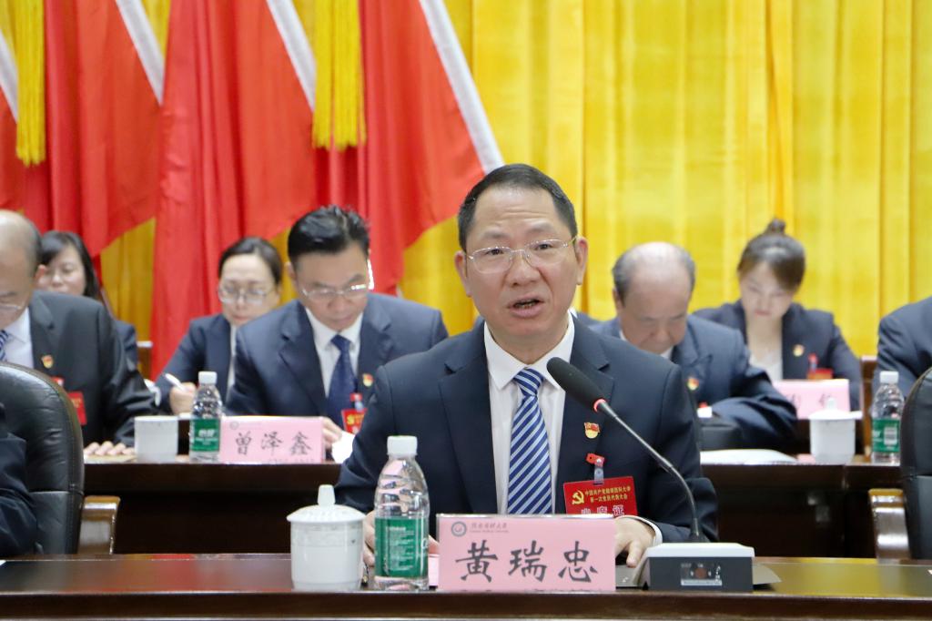 黄瑞忠致开幕词,代表大会主席团和上一届党委,对大会的召开表示热烈祝贺,向亲临大会指导的各位领导表示热烈欢迎,向长期以来关心支持学校建设发展的各级领导和社会各界以及学校离退休老同志、广大海内外校友表示衷心感谢,向各位代表并通过他们向学校全体党员干部和师生员工致以诚挚问候。希望全体与会代表,以高度的政治责任感和使命感,聚精会神开好这次大会,认真履行好代表职责,正确行使好自己的民主权利,集思广益,群策群力,真正把这次大会开成一个凝心聚力的大会、开拓创新的大会、继往开来的大会,为建设特色鲜明、区域一流、国内知名的高水平医科大学贡献智慧和力量。