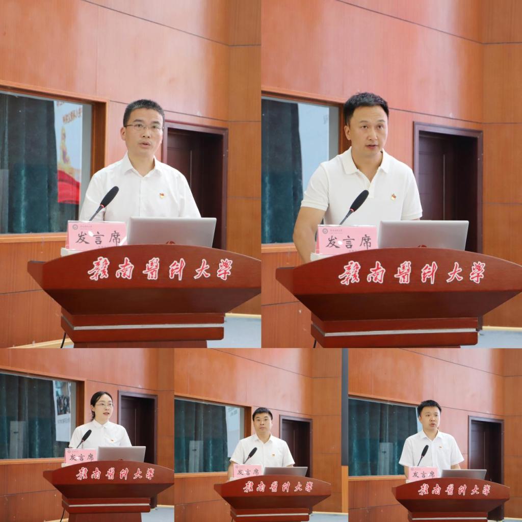 会上,基础医学院、医学信息工程学院、马克思主义学院、第一附属医院(第一临床医学院)、第二附属医院(第二临床医学院)、第三临床医学院(第三附属医院、附属口腔医院)等6个下属党委书记代表以及机关第九党支部、康复学院研究生党支部、护理学院本科生第一党支部、公共卫生与健康管理学院教工第二党支部、创新与转化医学研究院创新药物研发党支部等5个基层党支部书记代表就学习教育前一阶段开展情况和下一步工作打算进行了汇报。
