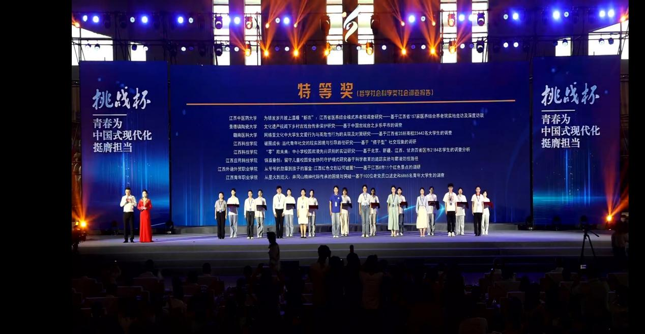 6月8日,第十九届“挑战杯”江西省大学生课外学术科技作品竞赛终审决赛在南昌举行。我校6支参赛团队从全省44所高校217个入围项目中突围,斩获特等奖1项、一等奖3项、二等奖2项,并捧得“优胜杯”,创历史最佳战绩。