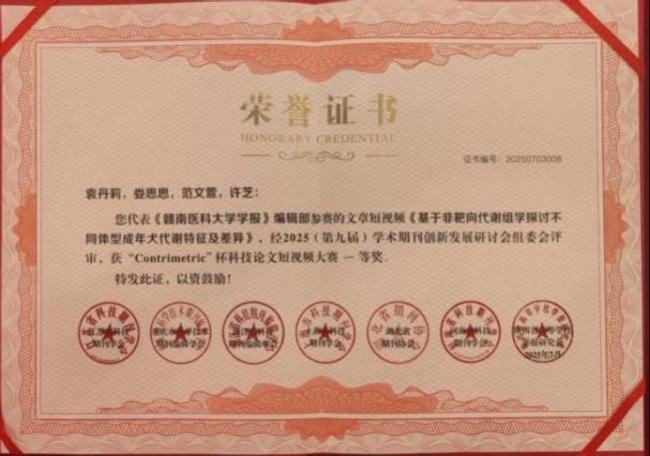 7月2日至4日,第九届学术期刊创新发展研讨会暨第二届“Contrimetric”杯科技期刊论文短视频大赛在重庆召开,我校《赣南医科大学学报》编辑部报送的视频摘要作品《基于非靶向代谢组学探讨不同体型成年犬代谢特征及差异》荣获一等奖。