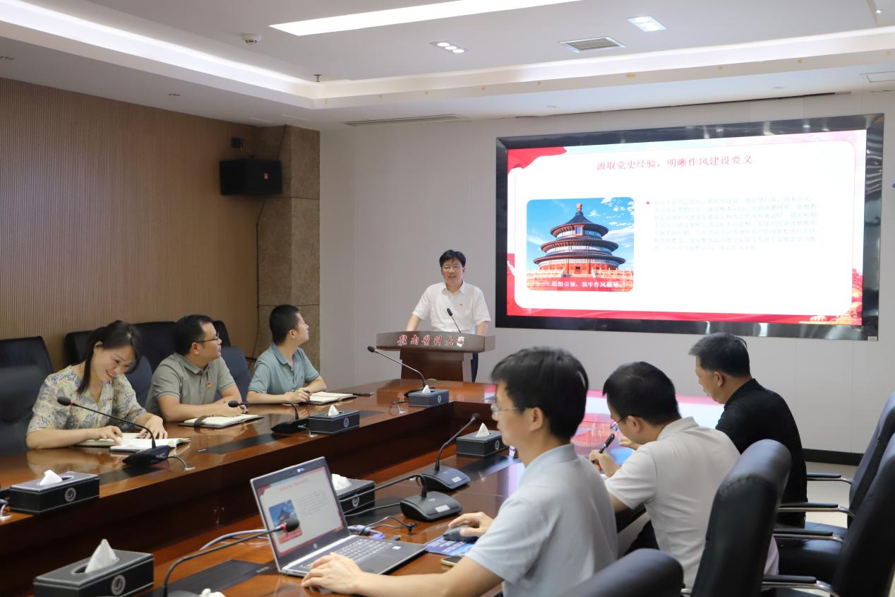 7月1日下午,学校党委常委、宣传部部长廖志平以《坚定信念强作风 勇担使命谱新篇》为题,为机关党委第三党支部全体党员讲授深入贯彻中央八项规定精神学习教育专题党课。