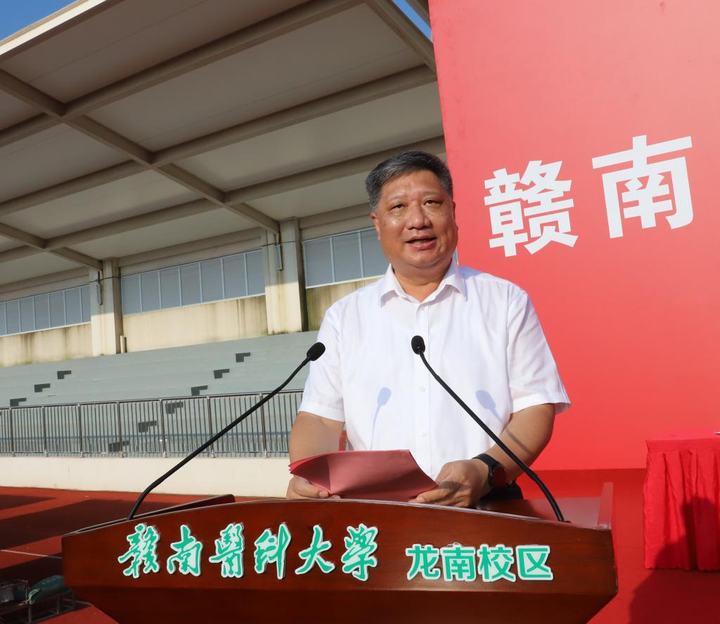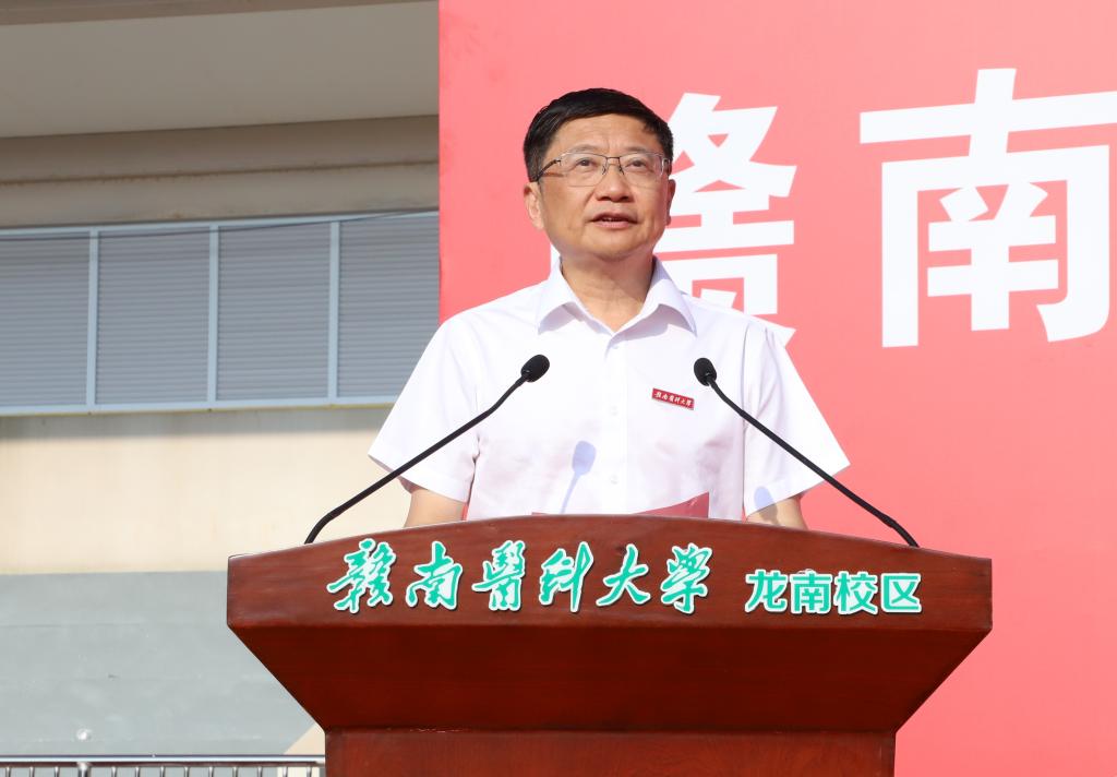 钟旭辉代表龙南市委、市政府向全体新同学表示热烈欢迎,向为校区建设与发展辛勤付出的领导、老师们致以崇高敬意,向关心支持龙南发展的社会各界朋友表示衷心感谢。他表示,龙南正全力打造赣州医疗康养副中心,比以往任何时候都更需要高素质的医疗卫生人才,期盼同学们能把龙南当作“第二故乡”,把自己的青春理想融入健康龙南的建设中。龙南将一如既往地支持学校的建设发展,陪伴同学们在“医者仁心”的道路上坚定前行,共同书写美好未来。
