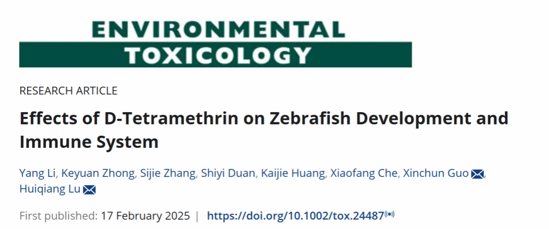 该论文首次系统评估了D-胺菊酯(杀虫剂)对斑马鱼发育的影响及免疫毒性,并发现D-胺菊酯显著影响斑马鱼的免疫系统和氧化应激水平,诱导细胞凋亡并抑制胚胎发育。此结果为D-胺菊酯的毒性及其环境残留物的潜在危害提供了新数据,具有重大意义。论文通讯作者为陆辉强教授和郭新春教授。