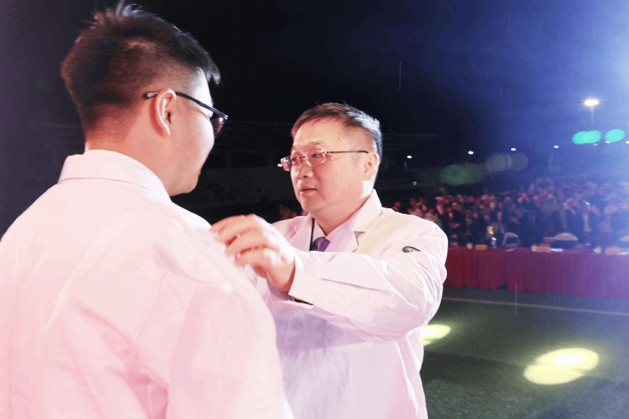 “医路启航礼”上,院领导及教师代表为新生代表授白袍、传使命,寄寓殷切期许。