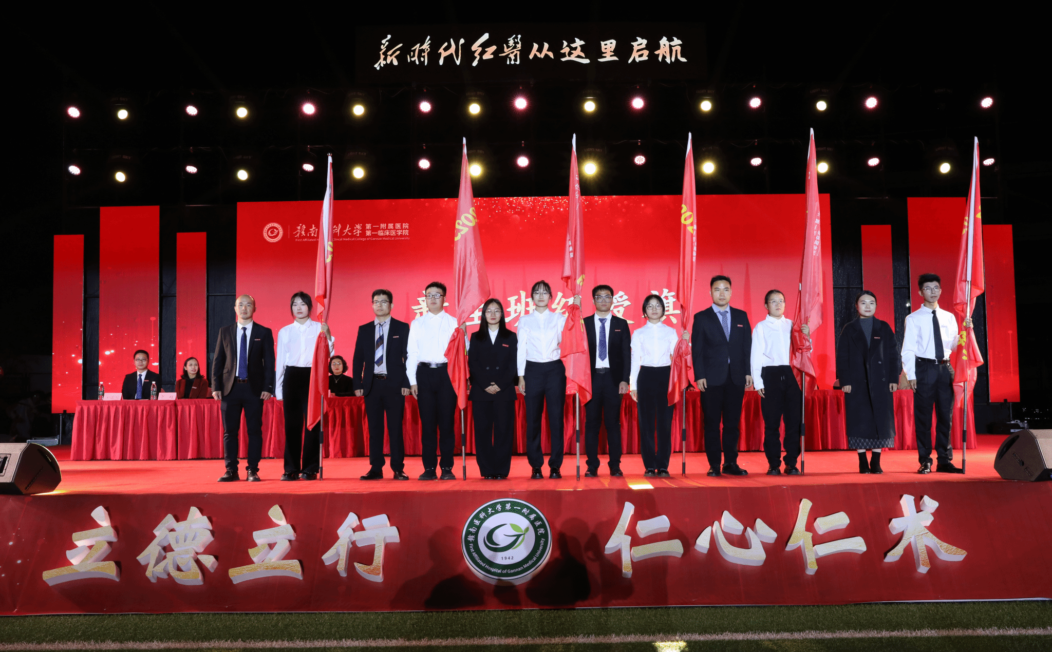 温情环节里,班主任为新生班送寄语、授班旗,“红医”班名醒目于旗上。2025级班级统一以“红医”命名,既呼应医学红色育人传统,又借“博学”“仁心”等后缀锚定培育方向——如“红医杏林班”承传统医脉、“红医慎独班”守医学伦理,班名既是班级符号,更是红医精神的新生传承。
