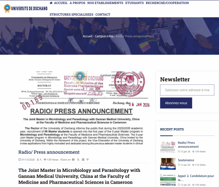 近日,我校与喀麦隆姜镇大学(University of Dschang)合作开设的“药学”和“微生物与寄生虫学”联合硕士研究生培养项目正式启动招生,这是我校首个来华留学教育中外联合培养硕士项目。该项目是两校为应对公共卫生挑战、深化中非教育合作而共同推动的实质性举措。