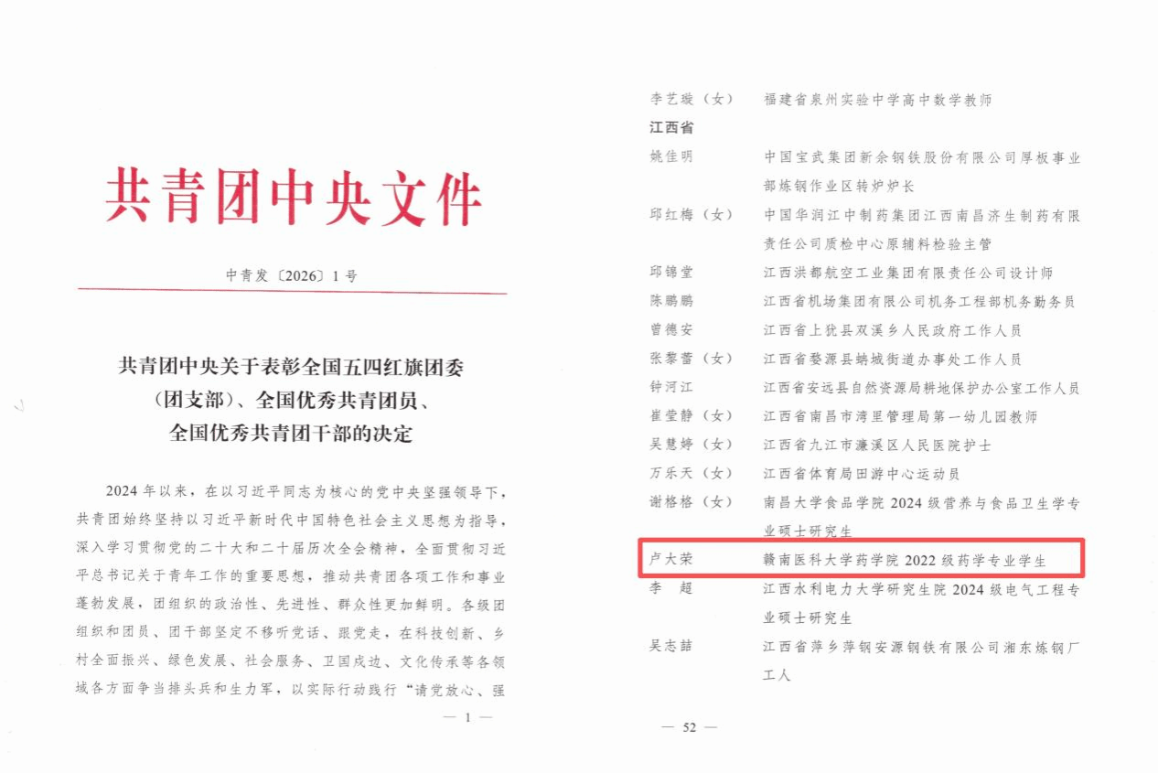 近日,共青团中央印发《关于表彰全国五四红旗团委(团支部)、全国优秀共青团员、全国优秀共青团干部的决定》,我校药学院2022级药学专业本科生卢大荣同学荣获“全国优秀共青团员”称号。该荣誉是共青团中央授予团员个人的最高荣誉,也是我校团员青年首次获得该项国家级荣誉。