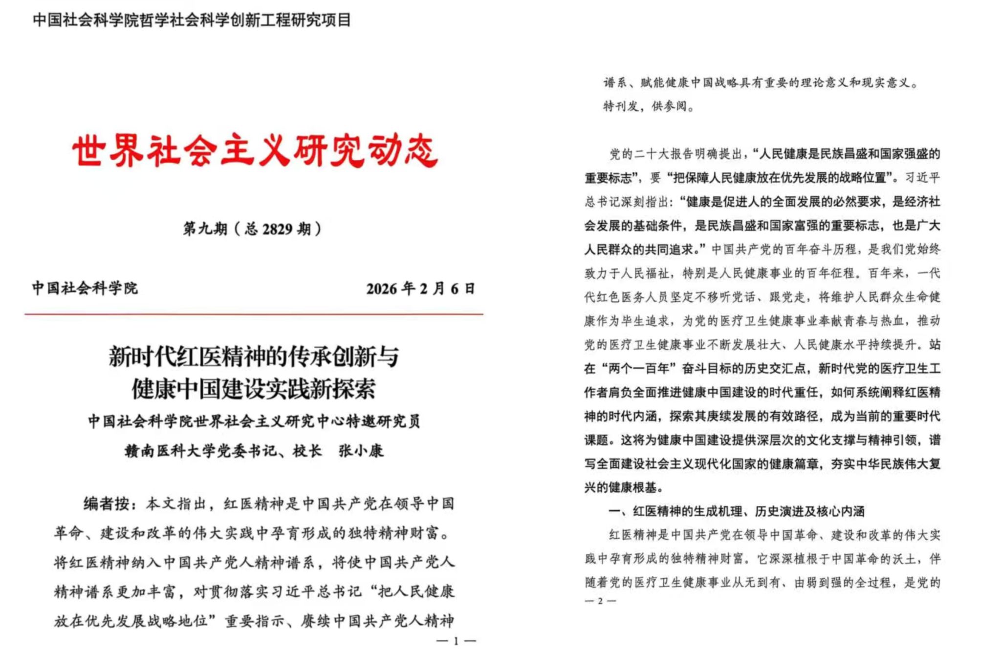 近日,我校党委书记、校长张小康同志在重要学术刊物《世界社会主义研究动态》2026年第9期,发表了题为《新时代红医精神的传承创新与健康中国建设实践新探索》的长篇署名文章,并被聘为中国社会科学院世界社会主义研究中心特聘研究员。该文发表后,在相关学术界与政策研究领域引起了广泛的关注和积极反响。