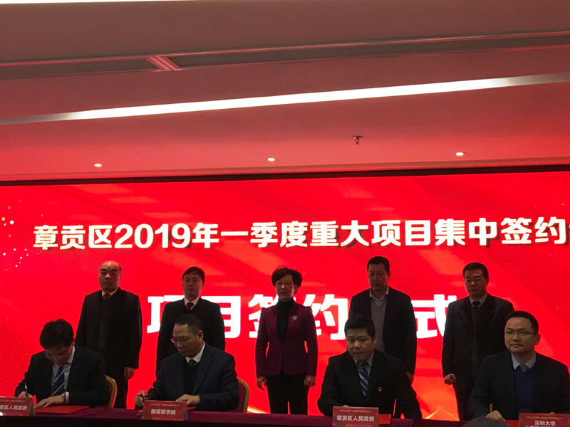 2月23日上午,赣州市章贡区举行2019年一季度重大项目集中签约。学校党委委员、副校长黄瑞忠代表学校与章贡区人民政府签订生物医药产业研究院战略合作协议。双方将在人才培养、共建科技创新孵化平台、科研成果共享与转化等方面开展深入合作。赣州市委常委、宣传部长、章贡区委书记胡雪梅出席并讲话。