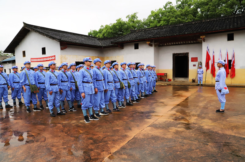 在红军广场烈士纪念塔前,全体学员冒雨列队,向革命先烈默哀致敬、敬献花篮,面对党旗重温入党誓词;在“一苏大”旧址,参与预演选举,高唱《国际歌》;在红井边,尝一尝红井水,缅怀伟大领袖毛泽东。在马道口“长征第一村”,学员们身穿红军服,开展队列训练,颂读《红色家书》,喝一口壮行酒,出发重走长征路,随后模拟闯关夺隘、抢救伤员、爬雪山过草地、飞夺泸定桥······将仪式教学和体验教学相结合,深入体会长征精神。