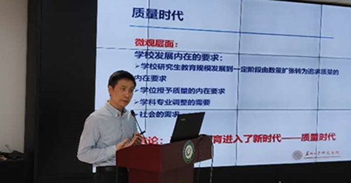 曹健院长和张进平副院长分别作了《夯实基础,提高质量——学位与研究生教育改革及思考》和《如何做好研究生培养工作》的专题报告。两位教授分别从宏观和微观的角度,详细介绍了苏州大学研究生教育的发展历程、改革措施和成效、学科建设思路、未来布局,分享了博士、硕士研究生培养的成功经验。