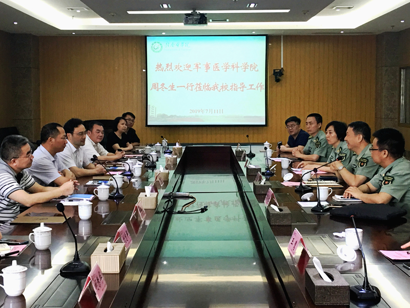 7 月 11 日,军事医学科学院军事医学研究院微生物流行病研究所党委副书记、纪委书记、大校贾兵一行7人到我校访问交流并座谈。党委副书记、校长刘潜,党委委员、副校长黄瑞忠出席,研究生工作处、科研产业处、学科建设办公室、基础医学院等主要负责同志及学位点导师代表参与座谈。