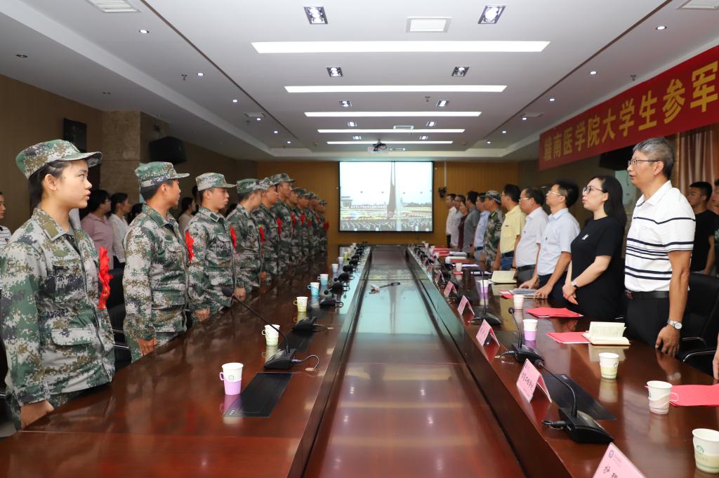 9月8日上午,我校2019年大学生参军入伍欢送会在黄金校区召开。学校党委副书记曾泽鑫,党委委员、副校长叶军明出席会议,武装部、宣传部、学工处、团委等部门领导、各二级学院负责人、12名参军入伍新兵及班主任、在校生代表参加欢送会。