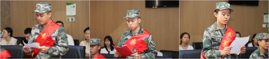 毕业生参军入伍代表夏佳琛、在校生参军入伍代表温华能、女兵参军入伍代表吕丽渟分别发言,代表新兵感谢学校的教育和培养,并庄严承诺:作为一名大学生,用自己的知识和技能为国防建设事业作贡献是光荣的义务和责任。到部队后,一定会服从命令、刻苦训练、吃苦在前、甘愿奉献,使自己尽快从一名普通大学生成长为一名合格的、优秀的军人,争取早立军功,为母校增光添彩,为国防和军队现代化建设贡献自己的青春、智慧和力量。