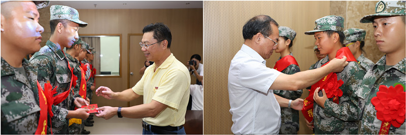 曾泽鑫、叶军明分别为每一名新兵披上“参军光荣”授带、戴上红花,并颁发奖金。