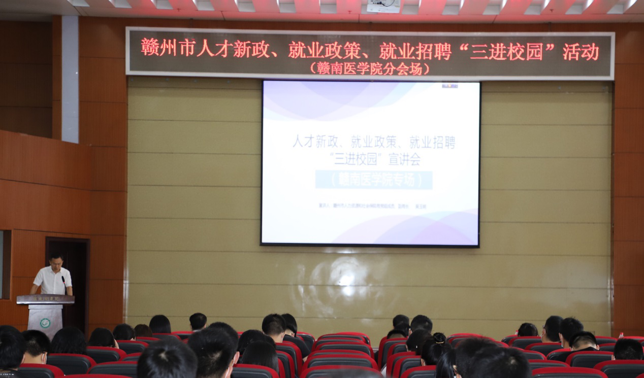 6月13日上午,由中共赣州市委人才办、赣州市人力资源和社会保障局组织的赣州市人才新政、就业政策、就业招聘“三进校园”活动在黄金校区举行,市人社局党组成员、副局长吴玉明,学校党委委员、统战部部长赖传景出席。招生与就业管理处副处长赖燊荣主持。