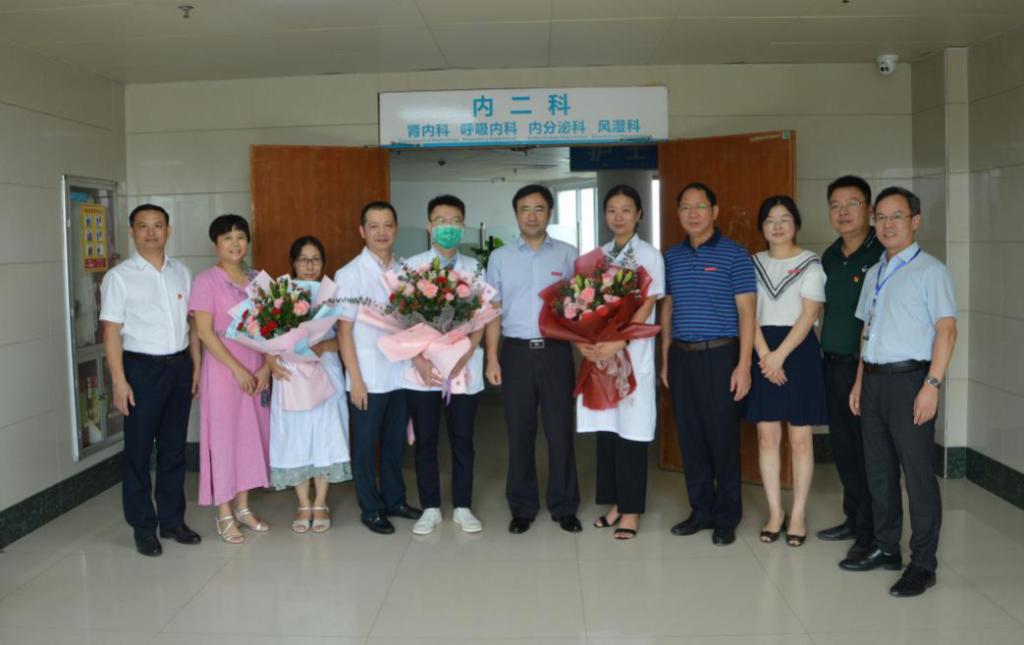 刘潜、黄瑞忠一行来到该院内二科看望慰问援鄂抗疫医务人员和优秀医师代表,详细询问他们的工作和生活情况。走访了内一科、儿科、中医科、康复医学科,了解科室学科建设、医师队伍、科室发展及住院患者治疗情况,勉励广大医师大力践行敬佑生命、救死扶伤、甘于奉献、大爱无疆的崇高精神,全面提升医院服务水平,加快补齐短板,更好地为人民群众服务。