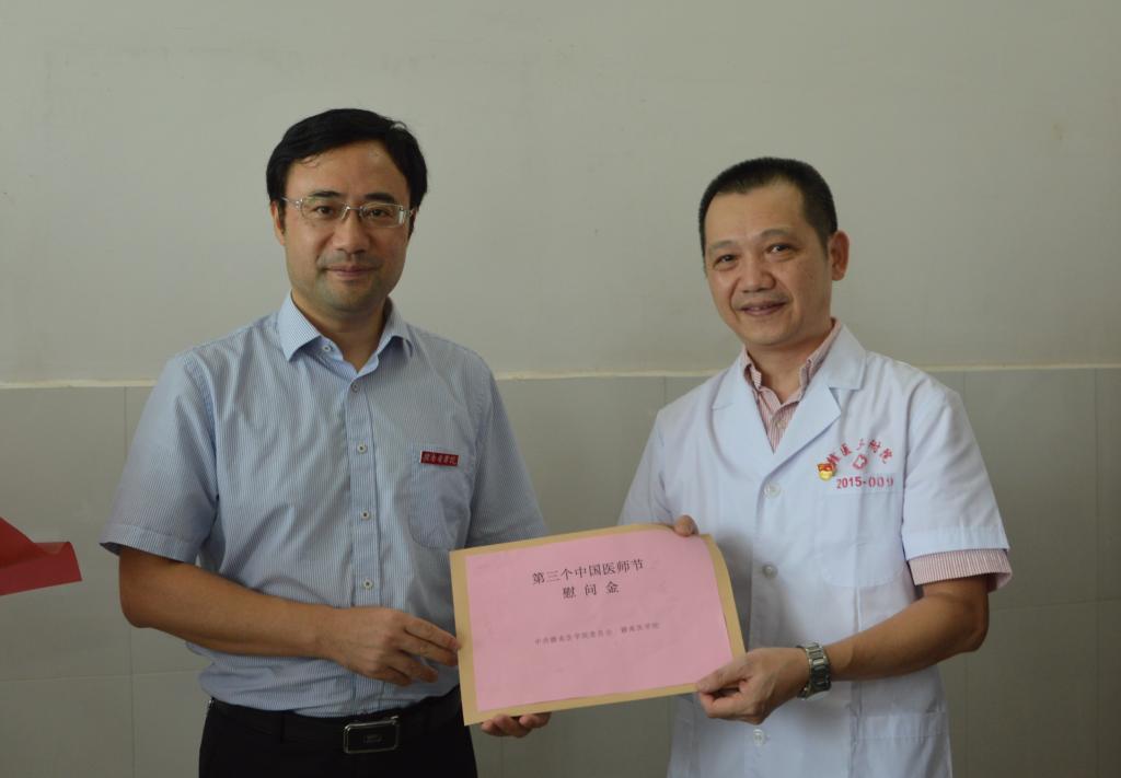 8月19日是第三个“中国医师节”,学校党委副书记、校长刘潜,党委委员、副校长黄瑞忠一行代表学校党政到三附院走访慰问,为全院医师送上节日祝福、鲜花和慰问金。