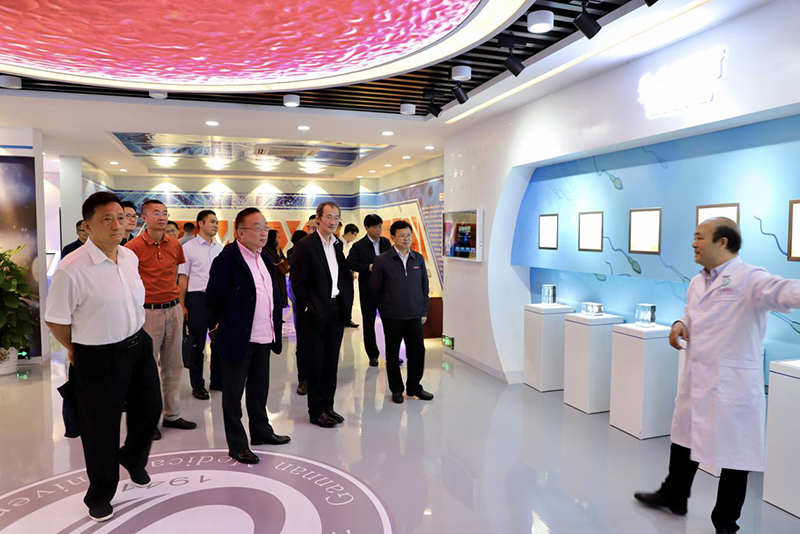 在人体生命科学馆内,解剖学专业教师向谈向东一行介绍了馆内布局和铸型标本,通过生动专业的讲解,传递了丰富的生命和健康知识,共同见证了学校“五大工程”建设发展的成果。