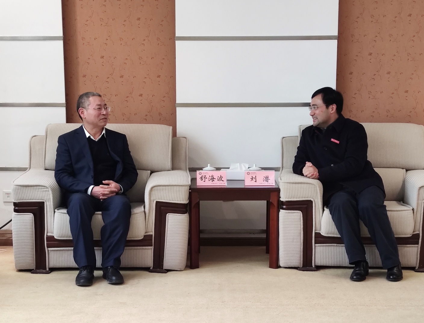 刘潜代表学校对舒海波一行来校交流工作表示热烈欢迎,双方就人才培养和校企合作方面的工作交流了意见。