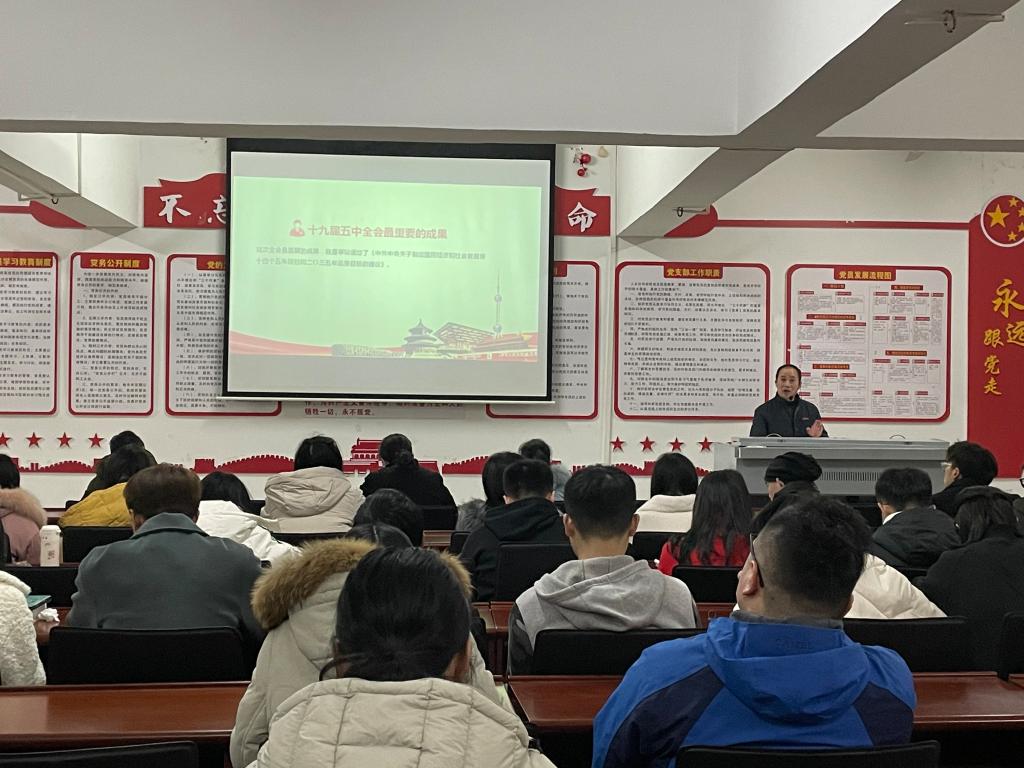 12月30日晚,学校党委委员、统战部长赖传景到人文社科学院学生第二党支部宣讲党的十九届五中全会精神。
