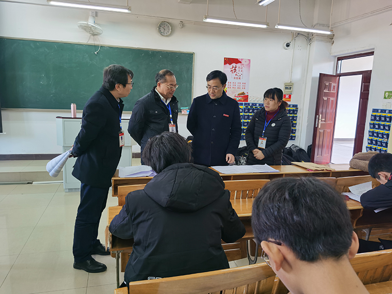 刘潜每到一处,便仔细向监考员询问考试有无异常、学生证件是否一一核验、试卷印刷有无纰漏、考试操作流程是否熟知。当看到有学生提前交卷,刘潜亲关切地询问学生考试情况,并叮嘱学生在寒冷时期要照顾好自己的生活;看到教室的灯光略显昏暗,他指示教务处及时做好采光检测,以免影响学生视力。