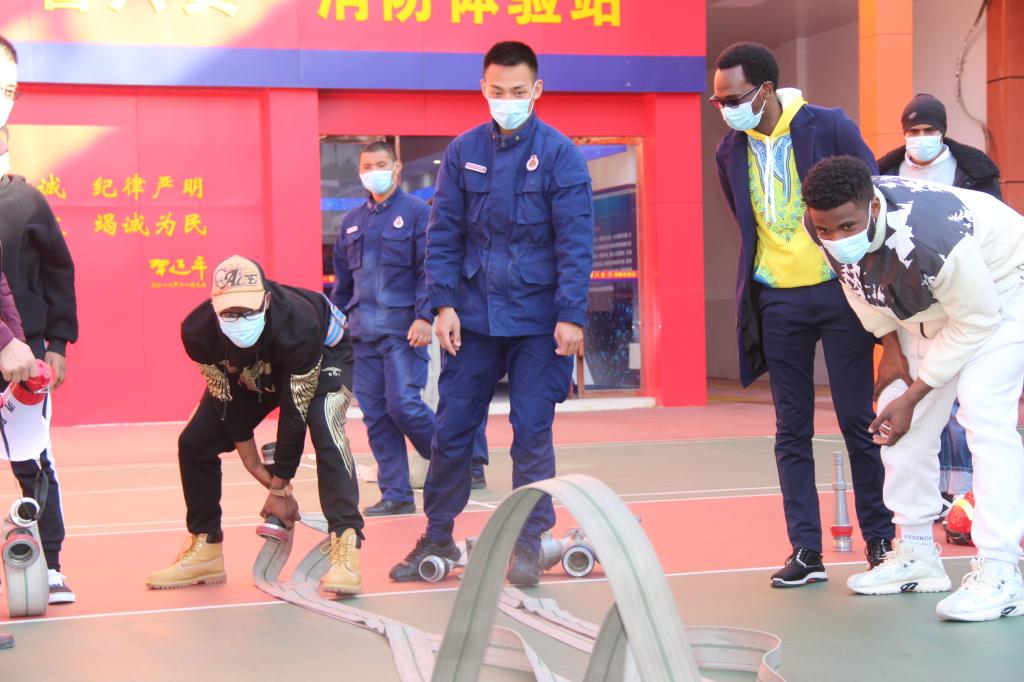 活动中,消防救援指战员向留学生详细介绍了各类消防车辆及个人装备的用途,现场模拟了火灾报警、如何防火、灭火和逃生等自救技能。留学生在指战员的指导下零距离体验了液压钳、灭火器、消防水带、消防云梯等消防救援设备。