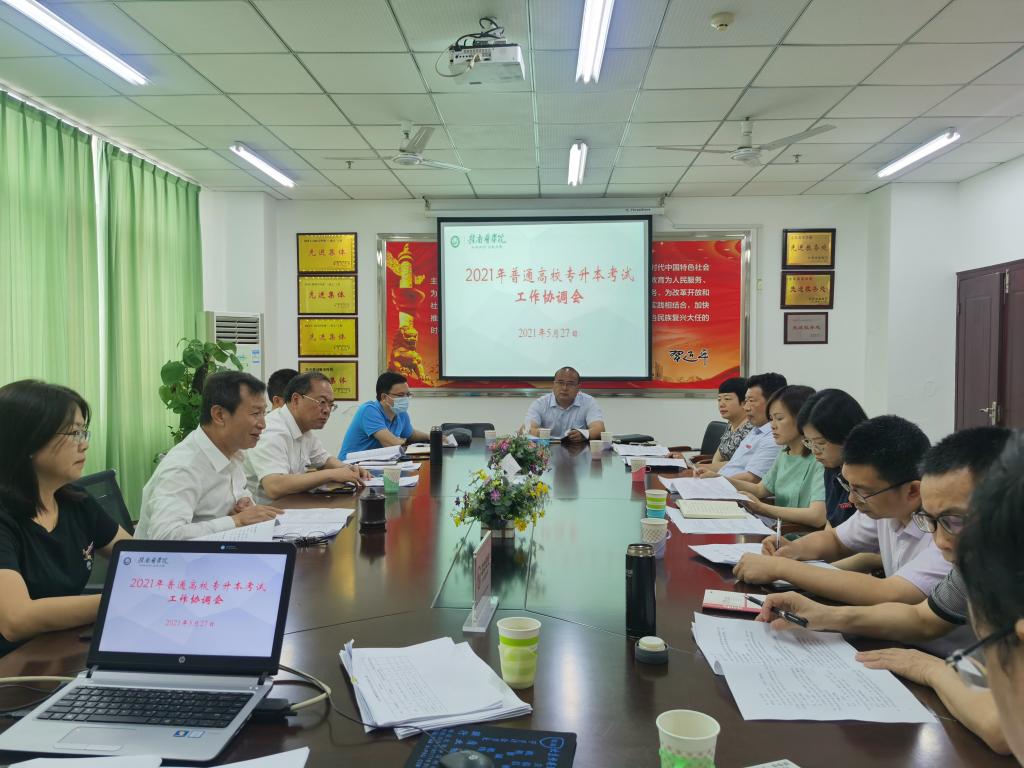 5月27日下午,我校在黄金校区召开2021年普通高校专升本考试工作协调会。学校党委委员、副校长叶军明出席。